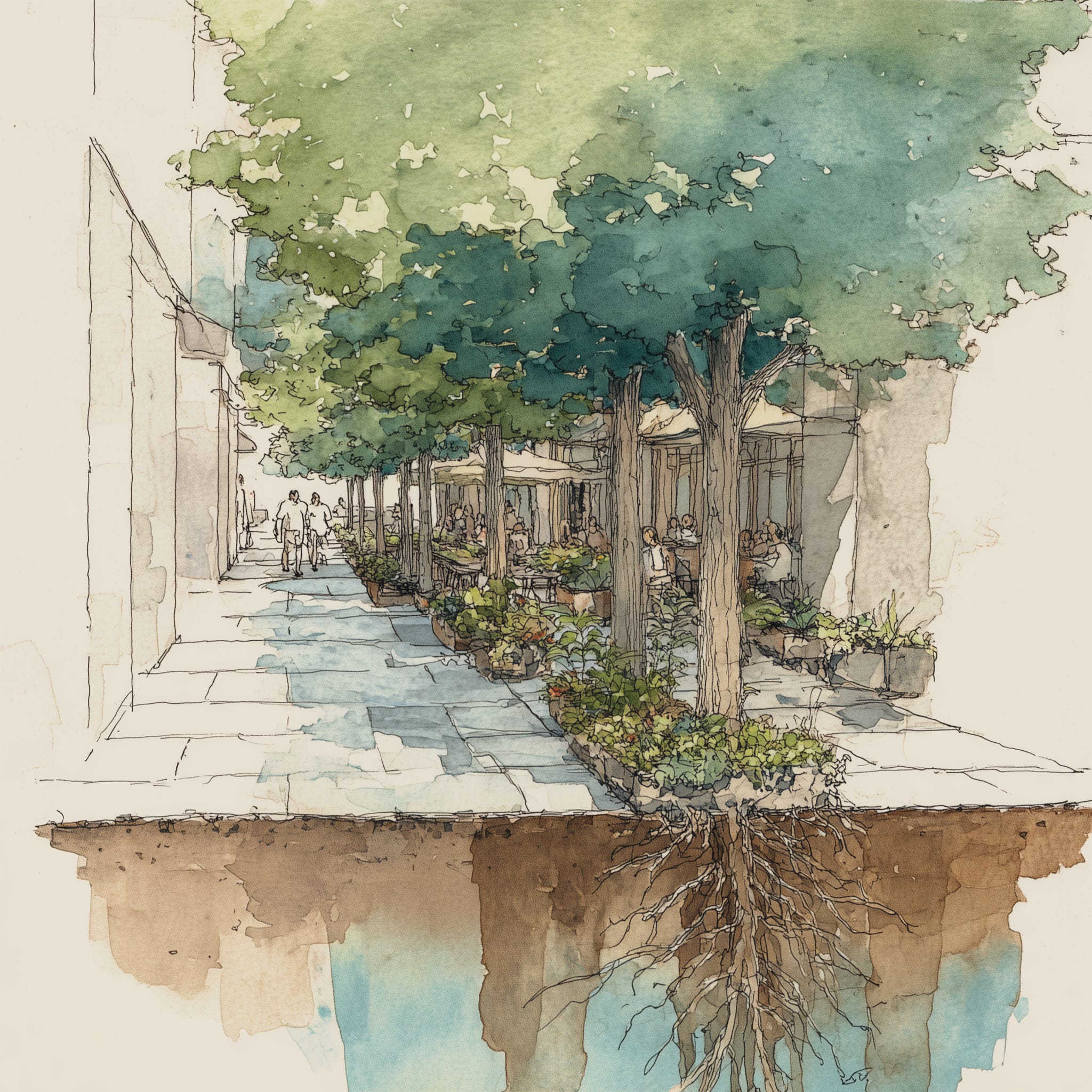 Trees in tiny soil prisons fail first when water runs out. Bigger soil volumes lead to bigger canopies, stronger roots, and real shade. In the context of Los Angeles’s climate, investing in proper soil volumes is especially critical. It underpins the city’s ability to grow a robust urban forest that can endure heat and drought. A helpful rule of thumb for healthy, long-lived trees is to provide at least 300 cubic feet for small trees (mature height under 25 feet), 600 cubic feet for medium trees (mature height between 25 and 40 feet), and 1,000 cubic feet for large trees (mature height over 40 feet). Whenever possible, exceeding these minimums will improve tree vigor and longevity. If you can’t reach these numbers, choose a smaller tree, link up your tree pits, and always opt for irrigation. The trees will thank you.